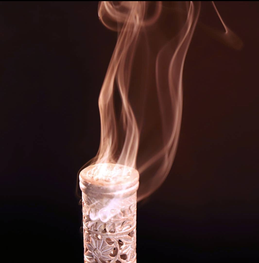 Soapstone Tower Incense Burner is an original artisan work, and traditional decorative art piece. Its ornamental patterns were meticulously cut and carved into the soft stone by skillful artisans who mastered this art through family heritage. The cut patterns allow the incense smoke to go out from within the burner and spread gracefully throughout the environment. This soapstone tower incense burner can be used for stick incense or cone incense. The incense is to be placed in upright position, at the base of the tower where there are four holes for stick incense, and flat surface for cone incense. The decorative tower is placed atop the base.