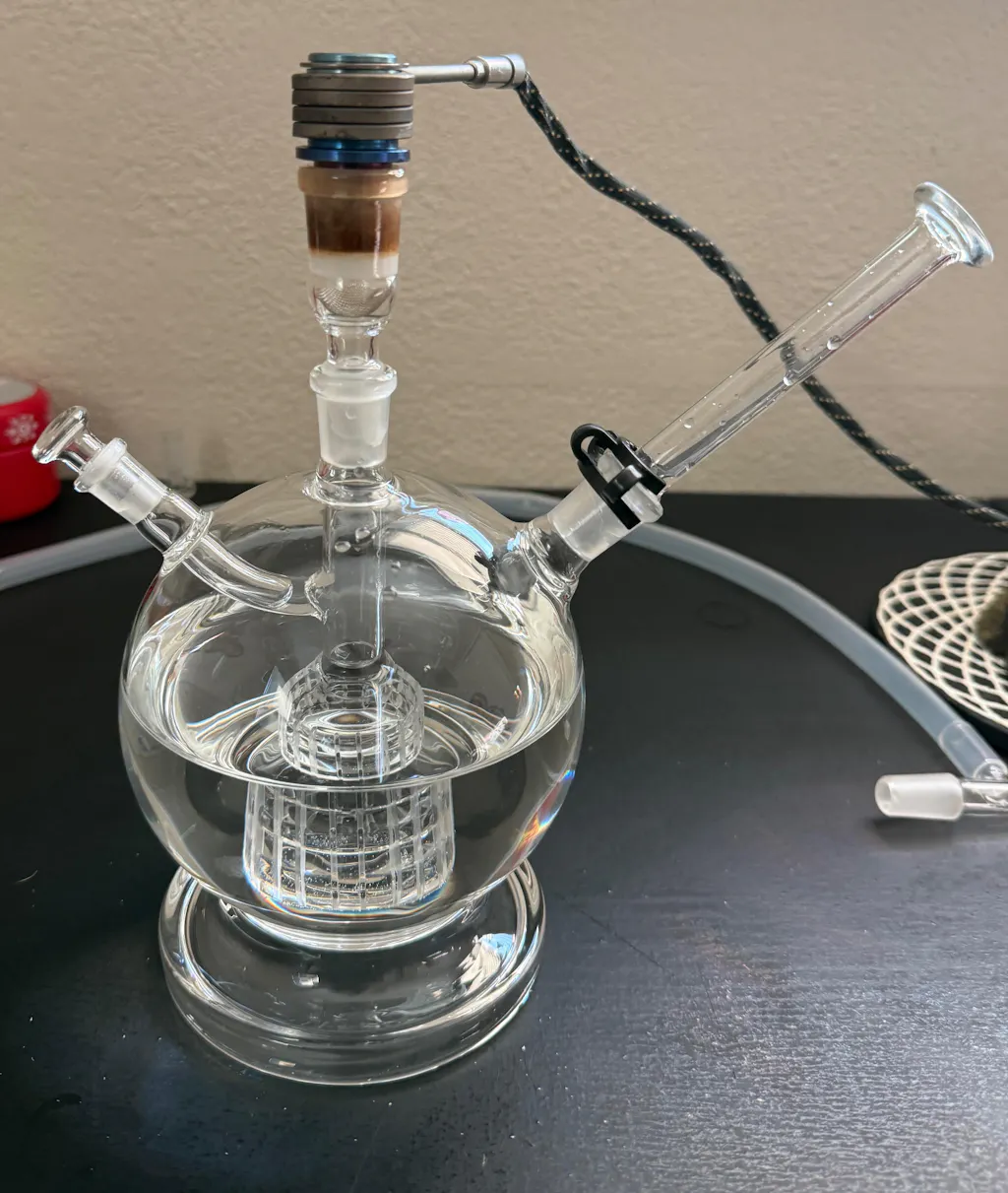Large volume water piece with Matrix percolator for open and cool rips! Comes with Trumpet Mouthpiece as well as Whip to Glass Mouthpiece. V3 includes a 10mm plug which can serve as either the pass through plug for clearing or as a second input for vapor. V3 now includes a stable base!